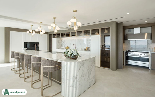 سقفهای بلند همراه با لوسترهای کریستالی و نورپردازی گرم، حس مجلل بودن را دوچندان میسازند. این سبک بیشتر برای ویلاهایی مناسب است که دکوراسیون کلی آنها بر اساس معماری لوکس و پرزرقوبرق طراحی شده باشد. آشپزخانه کلاسیک نهتنها محیطی کاربردی برای آشپزی است، بلکه فضایی برای نمایش هنر و سلیقه صاحبخانه محسوب میشود.