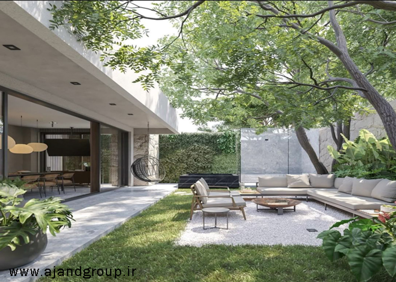 7. طراحی محوطه و فضای سبز ویلا بدون حیاط، باغ، استخر، روفگاردن یا آلاچیق، ناقص است. طراحی لنداسکیپ علاوه بر زیبایی، به آسایش و تعامل بهتر ویلا با طبیعت کمک میکند.